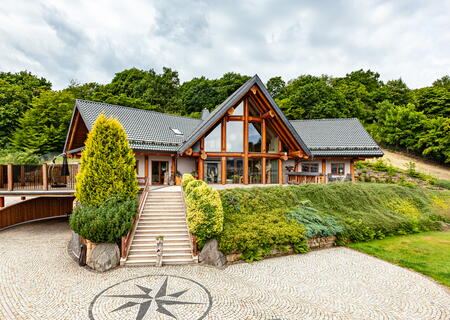 Das ebenerdige Chalet hat eine Größe von 80 qm und befindet sich im Musterhaus der Firma Löffler-Naturstammhaus GmbH & Co. KG. Es verfügt über eine Küche, ein Schlafzimmer, einen großzügigen Wohn- und Essbereich, ein Badezimmer und Fußbodenheizung.
