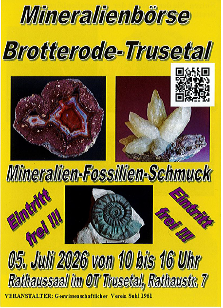 Nachdem die ersten zwei Börsen in Brotterode-Trusetal ein absoluter Erfolg waren und wir bei der dritten Börse die Besucherzahl noch einmal erheblich steigern konnten, werden wir zum Bergmannstag in der historischen Bergbaustadt Brotterode-Trusetal, die vierte Sommerbörse durchführen. Die Börse findet im Rathaussaal (Rathausstraße 7 im Ortsteil Trusetal) statt. Über 20 Aussteller aus ganz Deutschland und Pakistan und direkt aus der Region werden Ihnen auf ca. 75 laufenden Metern an Tischen wieder Schätze der Erde in allen Preiskategorien anbieten. Der Eintritt ist wie immer bei unseren Börsen frei. Wir haben bewusst diesen Ort gewählt, weil er nur 61 Kilometer vom Mittelpunkt Deutschlands entfernt ist und dem Börsenbesucher im Sommer noch ein paar zusätzliche Highlights bietet. Der berühmte Trusetaler Wasserfall, der Zwergen-Park, das Besucherbergwerk "Hühn", den Inselsberg und den Inselsberg-Funpark sowie Klangpfad und Schanzenanlage. So liebe Freunde der Mineralien, Fossilien und des Altbergbaus schreibt diesen Tag in Euren Kalender und erzählt es weiter. Bitte diesen Artikel auch tüchtig teilen. Parkplätze sind ausreichend vorhanden und der Zugang zum Gebäude ist ebenerdig. Für Essen und Trinken ist gesorgt, vom Steak über Thüringer Bratwurst bis zu Kaffee und Kuchen reicht das Angebot. Parkplätze sind direkt am Rathaus und in unmittelbarer Nähe. Unsere Börse ist auch für Rollstuhlfahrer problemlos zu erkunden.